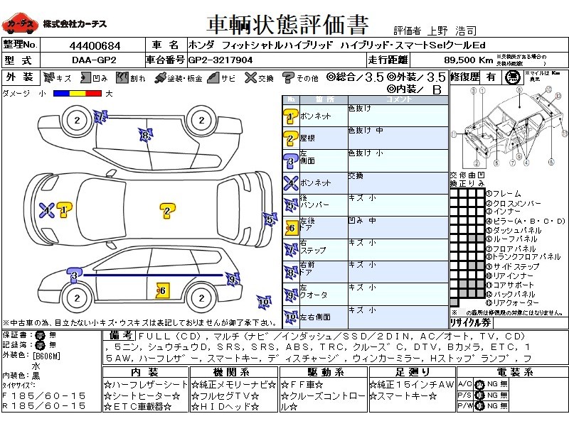 フル装備 / CD / マルチ(ナビ) / エアコン(オート) / テレビ(アナログ) / 乗車定員(5人) / 集中ドアロック / エアバッグ / 助手席エアバッグ / ABS / トラクションコントロール / クルーズコントロール / 地デジTV / バックカメラ / ETC / アルミホイール(15インチ) / ハーフレザーシート / スマートキー / ディスチャージ / ウインカーミラー / ハイマウントストップランプ / フォグランプ / サイドスポイラー / リアスポイラー /