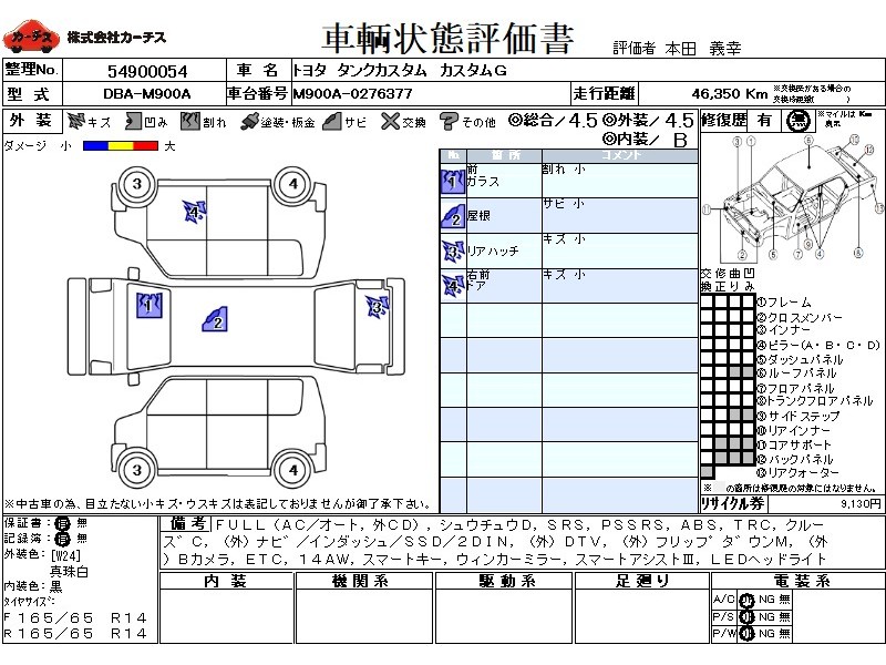 フル装備 / CD(社外) / 集中ドアロック / エアバッグ / 助手席エアバッグ / ABS / トラクションコントロール / クルーズコントロール / カーナビゲーション(社外)(インダッシュ,SSD,2DIN) / テレビ(社外) / 地デジTV(社外) / ETC / アルミホイール(14インチ) / スマートキー / ウインカーミラー / ハイマウントストップランプ / パワースライドドア / フォグランプ / フロントスポイラー /