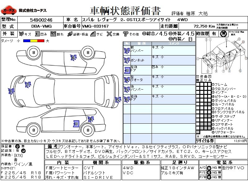 ワンオーナー 本革シート アイサイトVER.3&セイフティプラス 純正OPパナソニック8インチSDナビ&連動ETC2.0 フルセグTV BTオーディオ DVD再生 バック/フロント/サイドカメラ キーレスアクセス LEDヘッドライト&フォグ パドルシフト SI-DRIVE F席シートヒーター F席パワーシート 純正18インチアルミ ビルシュタインダンパー&STIサス 禁煙車