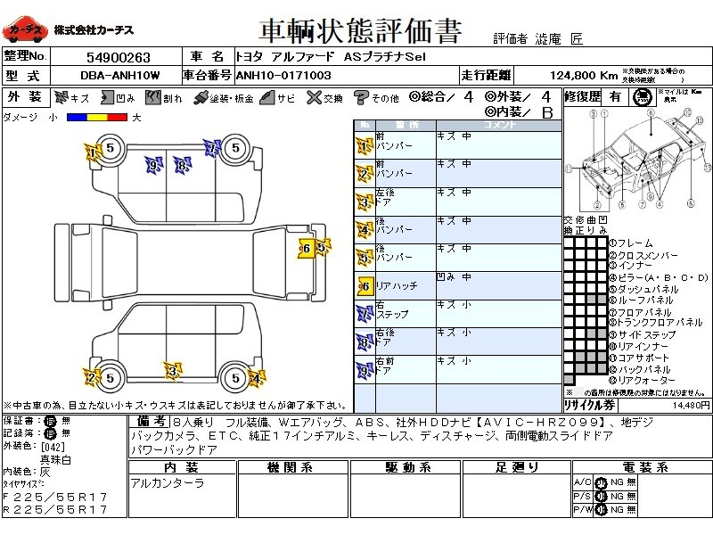 フル装備 / CD(社外) / 乗車定員(8人) / エアバッグ / 助手席エアバッグ / ABS / カーナビゲーション(社外)(インダッシュ,HDD,2DIN) / テレビ(アナログ) / ETC(社外) / アルミホイール(17インチ) / キーレスエントリー / ディスチャージ / パワースライドドア / パワーバックドア / フォグランプ / サイドスポイラー / リアスポイラー /