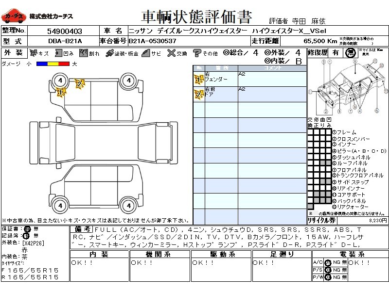 フル装備 / CD / 乗車定員(4人) / 集中ドアロック / エアバッグ / 助手席エアバッグ / サイドエアバッグ / ABS / トラクションコントロール / カーナビゲーション(インダッシュ,SSD,2DIN) / テレビ(アナログ) / 地デジTV / バックカメラ(フロント) / ETC(社外) / アルミホイール(15インチ) / ハーフレザーシート / スマートキー / ウインカーミラー / ハイマウントストップランプ / パワースライドドア / フォグランプ / サイドスポイラー / リアスポイラー /