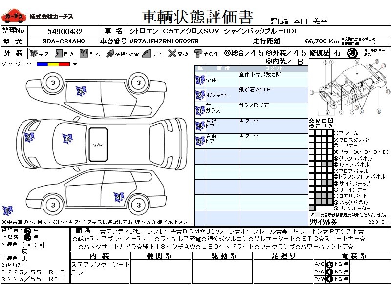 乗車定員(5人) / エアコン(オート) / パワーステアリング / パワーウィンドウ / 集中ドアロック / エアバッグ / 助手席エアバッグ / サイドエアバッグ / ABS / トラクションコントロール / クルーズコントロール / バックカメラ(サイドカメラ) / ETC(社外) / アルミホイール(18インチ) / サンルーフ / 革シート(黒) / スマートキー / ウインカーミラー / ハイマウントストップランプ / パワーバックドア / フォグランプ / ルーフレール / リアスポイラー /