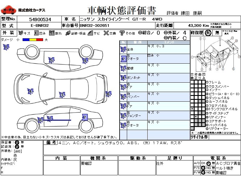 乗車定員(4人) / エアコン(オート) / パワーステアリング / パワーウィンドウ / 集中ドアロック / カセットデッキ / ABS / アルミホイール(社外)(17インチ) / リアスポイラー / マフラー(社外) / 足回り /