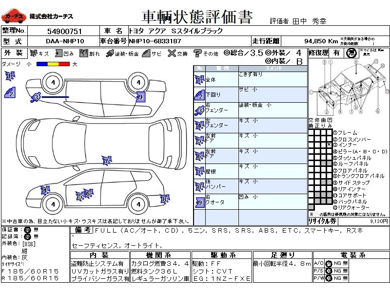 89.8万円 | 2019(R01)式 | 9.5万km | 紺 | 1500cc | AT | FF | 車検あり(2026/05/29まで) | 修復歴なし | 状態評価書