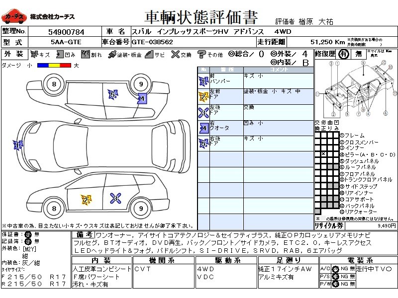 フル装備 / CD / エアバッグ / 助手席エアバッグ / サイドエアバッグ / ABS / トラクションコントロール / クルーズコントロール / カーナビゲーション(インダッシュ,2DIN) / 地デジTV / バックカメラ(フロント) / ETC / アルミホイール(17インチ) / スマートキー / ウインカーミラー / フォグランプ / サイドスポイラー / リアスポイラー / マフラー(社外) /