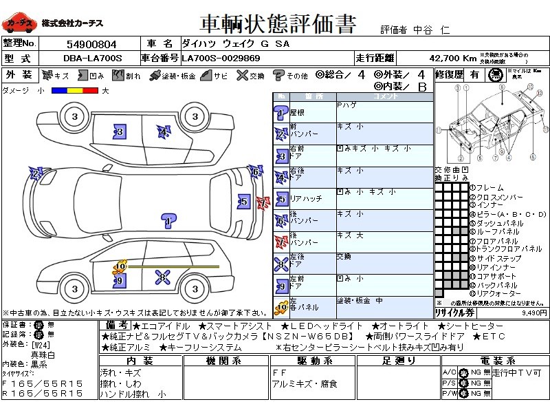 フル装備 / CD / 乗車定員(4人) / 集中ドアロック / エアバッグ / 助手席エアバッグ / サイドエアバッグ / ABS / トラクションコントロール / カーナビゲーション(インダッシュ,SSD,2DIN) / 地デジTV / バックカメラ / ETC / アルミホイール(15インチ) / スマートキー / ハイマウントストップランプ / パワースライドドア / フォグランプ /