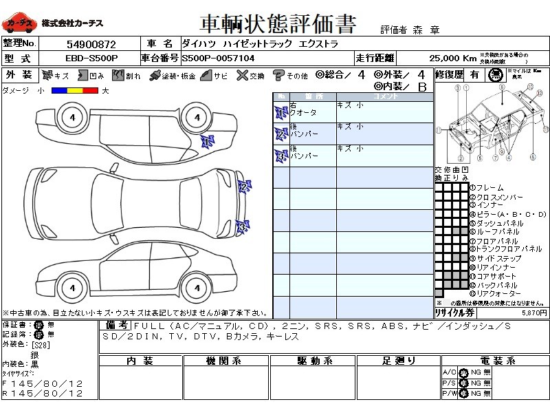 フル装備 / CD / 乗車定員(2人) / エアバッグ / 助手席エアバッグ / ABS / カーナビゲーション(インダッシュ,SSD,2DIN) / テレビ(アナログ) / 地デジTV / バックカメラ / ETC(社外) / キーレスエントリー /