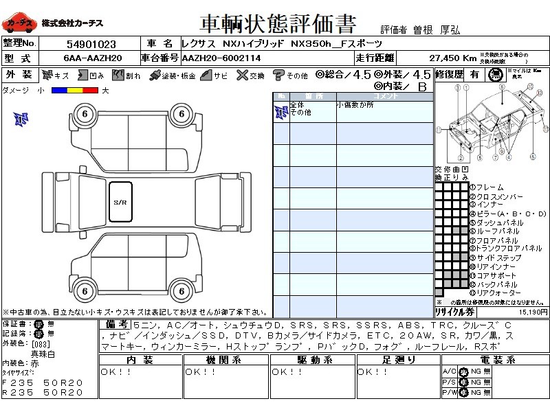 乗車定員(5人) / エアコン(オート) / パワーステアリング / パワーウィンドウ / 集中ドアロック / エアバッグ / 助手席エアバッグ / サイドエアバッグ / ABS / トラクションコントロール / クルーズコントロール / カーナビゲーション(インダッシュ,SSD) / 地デジTV / バックカメラ(サイドカメラ) / ETC / アルミホイール(20インチ) / サンルーフ / 革シート(黒) / スマートキー / ウインカーミラー / ハイマウントストップランプ / パワーバックドア / フォグランプ / ルーフレール / リアスポイラー /