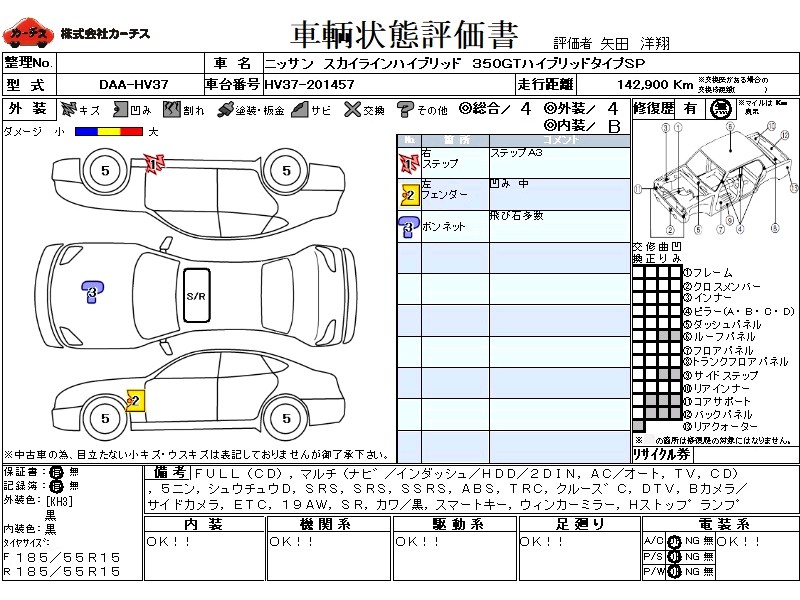 フル装備 / CD / マルチ(ナビ) / エアコン(オート) / テレビ(アナログ) / 乗車定員(5人) / 集中ドアロック / エアバッグ / 助手席エアバッグ / サイドエアバッグ / ABS / トラクションコントロール / クルーズコントロール / 地デジTV / バックカメラ(サイドカメラ) / ETC / アルミホイール(19インチ) / サンルーフ / 革シート(黒) / スマートキー / ウインカーミラー / ハイマウントストップランプ / フォグランプ /