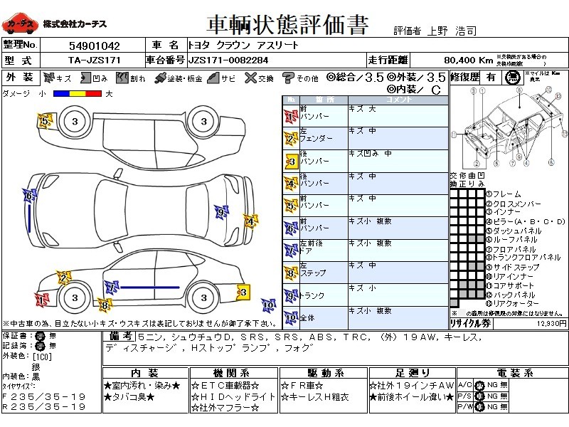 フル装備 / CD(社外) / 乗車定員(5人) / 集中ドアロック / エアバッグ / 助手席エアバッグ / ABS / トラクションコントロール / ETC(社外) / アルミホイール(社外)(19インチ) / キーレスエントリー / ディスチャージ / ハイマウントストップランプ / フォグランプ / マフラー(社外) /