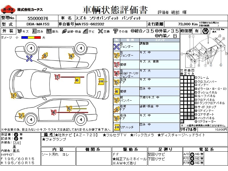 乗車定員(5人) / エアコン(オート) / パワーステアリング / パワーウィンドウ / CD / エアバッグ / 助手席エアバッグ / ABS / カーナビゲーション(社外)(インダッシュ,SSD,2DIN) / 地デジTV(社外) / ETC(社外) / アルミホイール(15インチ) / スマートキー / ディスチャージ / フォグランプ / サイドスポイラー / リアスポイラー /