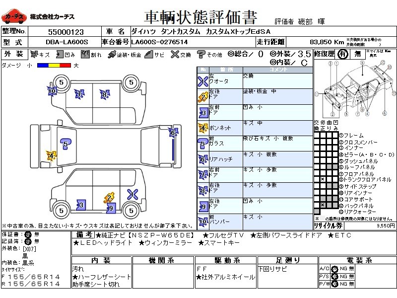 フル装備 / CD / 乗車定員(4人) / 集中ドアロック / エアバッグ / 助手席エアバッグ / ABS / トラクションコントロール / カーナビゲーション(インダッシュ,DVD,2DIN) / 地デジTV / アルミホイール(社外)(14インチ) / ハーフレザーシート / スマートキー / ウインカーミラー / ハイマウントストップランプ / パワースライドドア / フォグランプ / リアスポイラー /