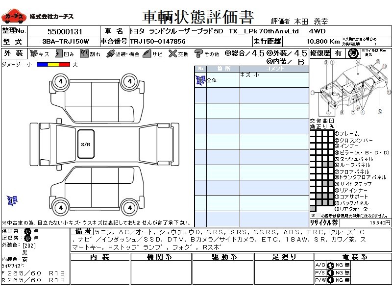 乗車定員(5人) / エアコン(オート) / パワーステアリング / パワーウィンドウ / 集中ドアロック / エアバッグ / 助手席エアバッグ / サイドエアバッグ / ABS / トラクションコントロール / クルーズコントロール / カーナビゲーション(インダッシュ,SSD) / テレビ(アナログ) / 地デジTV / バックカメラ(フロント) / ETC / アルミホイール(18インチ) / サンルーフ / 革シート(茶) / スマートキー / ウインカーミラー / ハイマウントストップランプ / フォグランプ / ルーフレール / リアスポイラー /