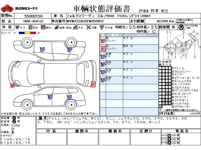 フル装備 / CD(社外) / 乗車定員(5人) / 集中ドアロック / エアバッグ / 助手席エアバッグ / サイドエアバッグ / ABS / トラクションコントロール / カーナビゲーション(社外)(インダッシュ,2DIN) / テレビ(アナログ) / ETC / アルミホイール(15インチ) / キーレスエントリー /