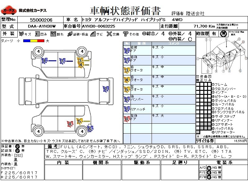 フル装備 / CD(社外) / 乗車定員(7人) / 集中ドアロック / エアバッグ / 助手席エアバッグ / サイドエアバッグ / ABS / トラクションコントロール / クルーズコントロール / カーナビゲーション(社外)(インダッシュ,SSD,2DIN) / テレビ(社外) / 地デジTV(社外) / ETC / アルミホイール(社外)(17インチ) / スマートキー / ウインカーミラー / ハイマウントストップランプ / パワースライドドア / フォグランプ / リアスポイラー /