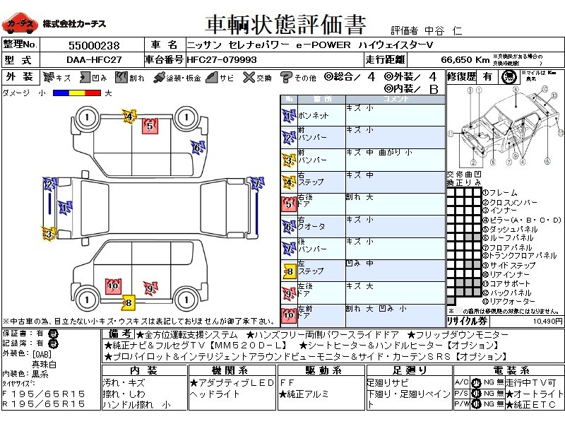 フル装備 / CD / 乗車定員(7人) / 集中ドアロック / エアバッグ / 助手席エアバッグ / サイドエアバッグ / ABS / トラクションコントロール / クルーズコントロール / カーナビゲーション(インダッシュ,SSD,2DIN) / 地デジTV / フリップダウンモニタ / バックカメラ(フロント) / ETC / アルミホイール(15インチ) / スマートキー / ウインカーミラー / ハイマウントストップランプ / パワースライドドア / フォグランプ /