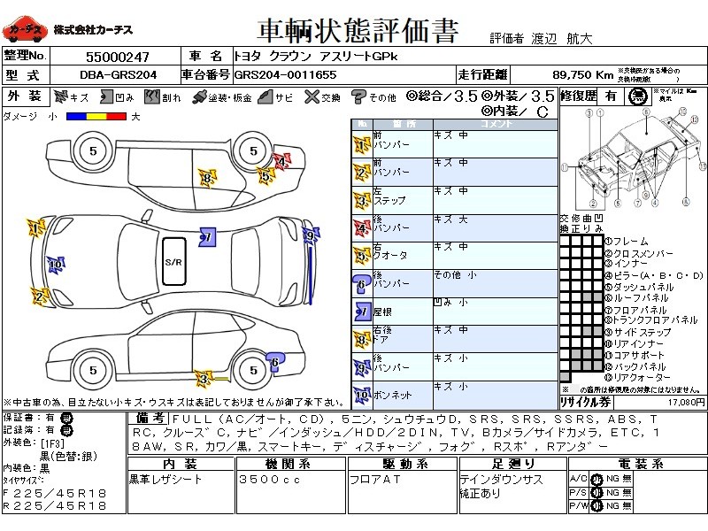フル装備 / CD / 乗車定員(5人) / 集中ドアロック / エアバッグ / 助手席エアバッグ / サイドエアバッグ / ABS / トラクションコントロール / クルーズコントロール / カーナビゲーション(インダッシュ,HDD,2DIN) / テレビ(アナログ) / バックカメラ(サイドカメラ) / ETC / アルミホイール(18インチ) / サンルーフ / 革シート(黒) / スマートキー / ディスチャージ / フォグランプ / リアスポイラー / リアアンダースポイラー / マフラー(社外) / 足回り /