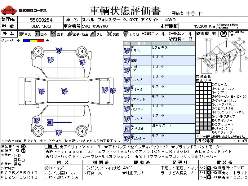 フル装備 / CD / 乗車定員(5人) / 集中ドアロック / エアバッグ / 助手席エアバッグ / サイドエアバッグ / ABS / トラクションコントロール / クルーズコントロール / カーナビゲーション(インダッシュ,SSD,2DIN) / 地デジTV / バックカメラ / ETC(社外) / アルミホイール(18インチ) / ハーフレザーシート / スマートキー / ウインカーミラー / ハイマウントストップランプ / パワーバックドア / フォグランプ / ルーフレール / リアスポイラー / マフラー(社外) /