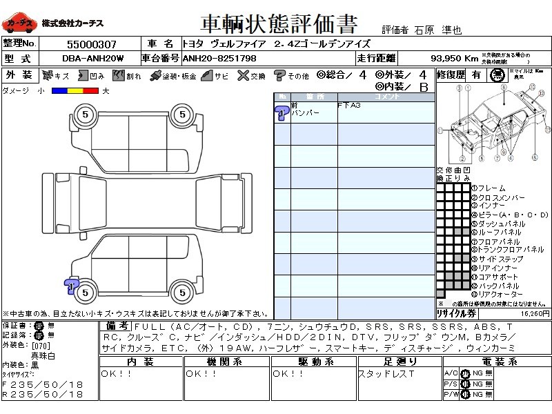 フル装備 / CD / 乗車定員(7人) / 集中ドアロック / エアバッグ / 助手席エアバッグ / サイドエアバッグ / ABS / トラクションコントロール / クルーズコントロール / カーナビゲーション(インダッシュ,HDD,2DIN) / 地デジTV / フリップダウンモニタ / バックカメラ(サイドカメラ) / ETC / アルミホイール(18インチ) / ハーフレザーシート / スマートキー / ディスチャージ / ウインカーミラー / ハイマウントストップランプ / パワースライドドア / パワーバックドア / フォグランプ / サイドスポイラー / リアスポイラー /