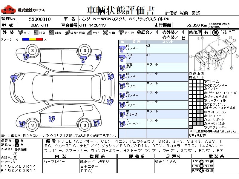 フル装備 / CD / 乗車定員(4人) / 集中ドアロック / エアバッグ / 助手席エアバッグ / サイドエアバッグ / ABS / トラクションコントロール / クルーズコントロール / カーナビゲーション(インダッシュ,SSD,2DIN) / 地デジTV / バックカメラ / ETC / アルミホイール(14インチ) / ハーフレザーシート / スマートキー / ウインカーミラー / ハイマウントストップランプ / フォグランプ / サイドスポイラー / リアスポイラー / リアアンダースポイラー /