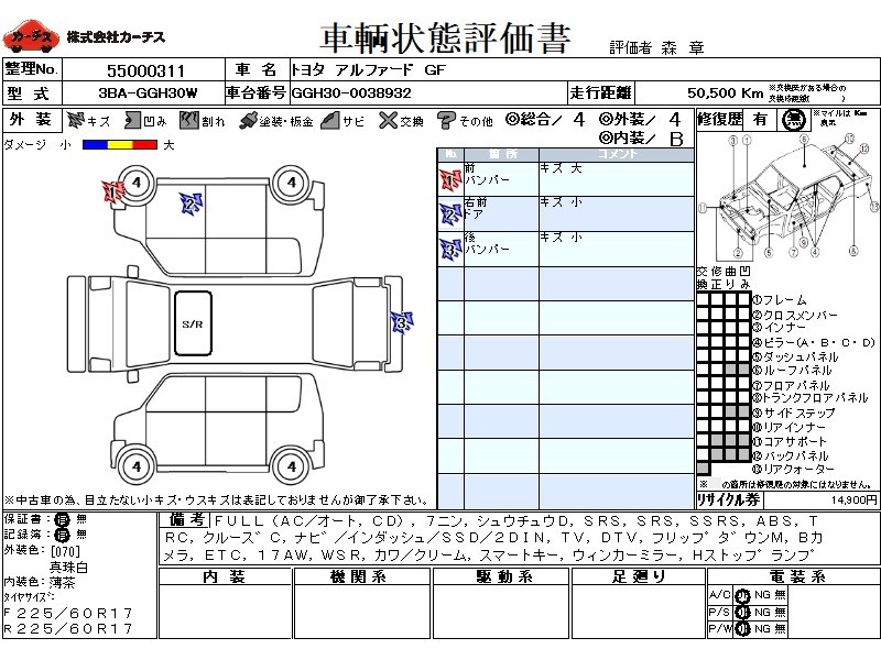 フル装備 / CD / 乗車定員(7人) / 集中ドアロック / エアバッグ / 助手席エアバッグ / サイドエアバッグ / ABS / トラクションコントロール / クルーズコントロール / カーナビゲーション(インダッシュ,SSD,2DIN) / テレビ(アナログ) / 地デジTV / フリップダウンモニタ / バックカメラ / ETC / アルミホイール(17インチ) / ダブルサンルーフ / 革シート(クリーム) / スマートキー / ウインカーミラー / ハイマウントストップランプ / パワースライドドア / パワーバックドア / フォグランプ / リアスポイラー /