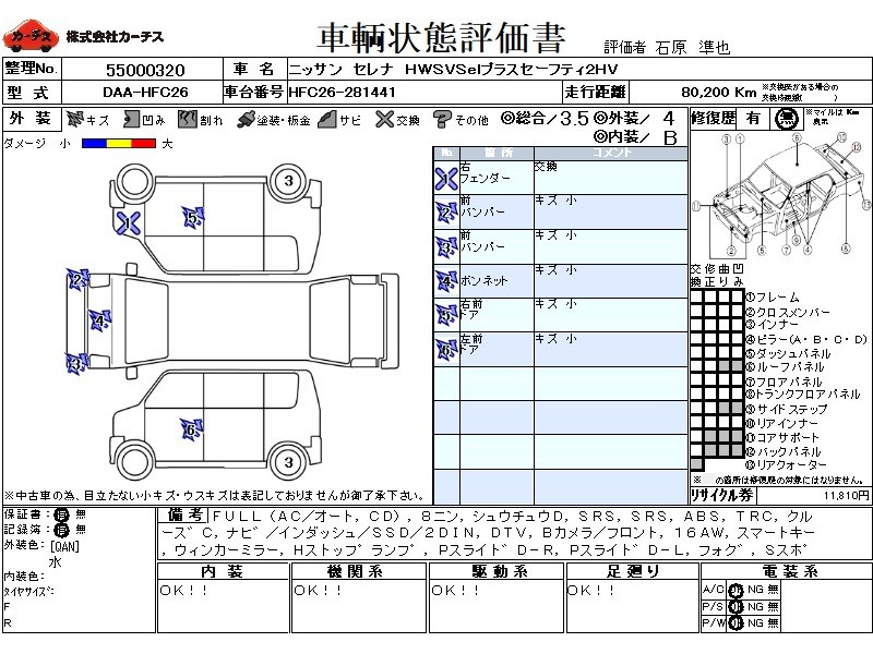 フル装備 / CD / 乗車定員(8人) / 集中ドアロック / エアバッグ / 助手席エアバッグ / ABS / トラクションコントロール / クルーズコントロール / カーナビゲーション(インダッシュ,SSD,2DIN) / 地デジTV / バックカメラ(フロント) / アルミホイール(16インチ) / スマートキー / ウインカーミラー / ハイマウントストップランプ / パワースライドドア / フォグランプ / サイドスポイラー /