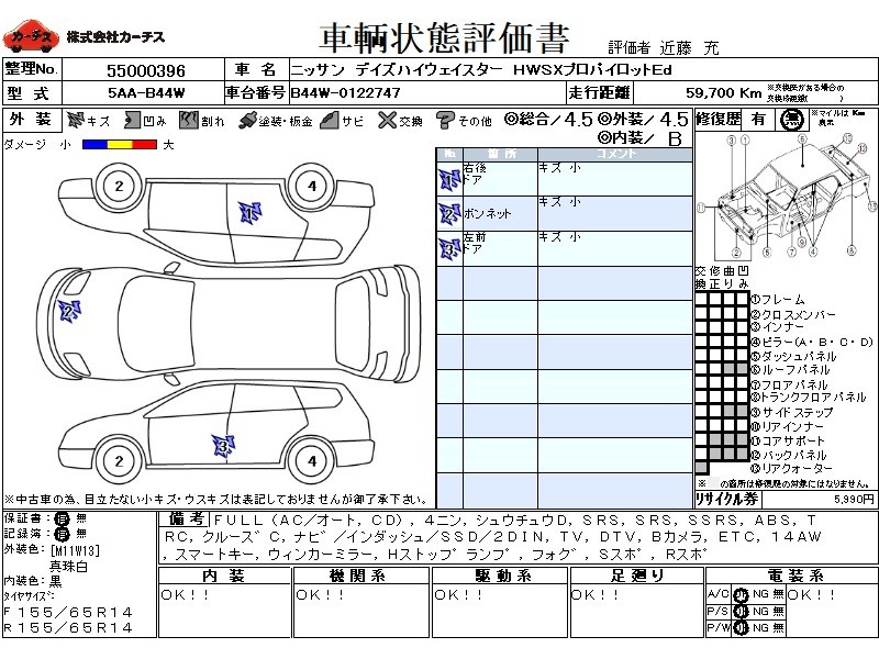フル装備 / CD / 乗車定員(4人) / 集中ドアロック / エアバッグ / 助手席エアバッグ / サイドエアバッグ / ABS / トラクションコントロール / クルーズコントロール / カーナビゲーション(インダッシュ,SSD,2DIN) / テレビ(アナログ) / 地デジTV / バックカメラ / ETC / アルミホイール(14インチ) / スマートキー / ウインカーミラー / ハイマウントストップランプ / フォグランプ / サイドスポイラー / リアスポイラー /