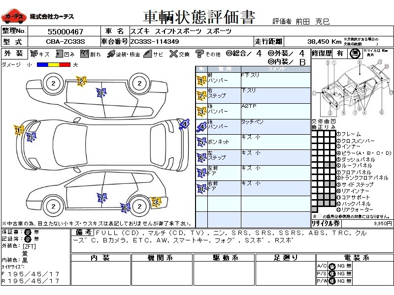 フル装備 / CD / 乗車定員(5人) / 集中ドアロック / エアバッグ / 助手席エアバッグ / サイドエアバッグ / ABS / トラクションコントロール / クルーズコントロール / カーナビゲーション(インダッシュ,SSD,2DIN) / テレビ(アナログ) / 地デジTV / バックカメラ / ETC / アルミホイール / スマートキー / ウインカーミラー / ハイマウントストップランプ / フォグランプ / サイドスポイラー / リアスポイラー /