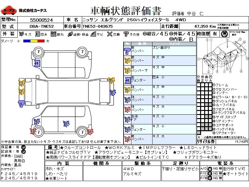 フル装備 / CD / 集中ドアロック / エアバッグ / 助手席エアバッグ / サイドエアバッグ / ABS / トラクションコントロール / クルーズコントロール / カーナビゲーション(インダッシュ,HDD,2DIN) / 地デジTV / バックカメラ(フロント) / ETC / アルミホイール(社外)(19インチ) / ハーフレザーシート / スマートキー / ウインカーミラー / ハイマウントストップランプ / パワースライドドア / フォグランプ / フロントスポイラー / リアスポイラー / マフラー(社外) /