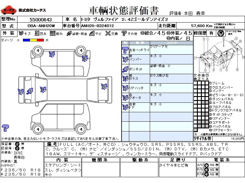フル装備 / CD(社外) / 集中ドアロック / エアバッグ / 助手席エアバッグ / サイドエアバッグ / ABS / トラクションコントロール / クルーズコントロール / カーナビゲーション(社外)(インダッシュ,SSD,2DIN) / テレビ(社外) / 地デジTV(社外) / ETC / アルミホイール(18インチ) / スマートキー / ディスチャージ / ウインカーミラー / ハイマウントストップランプ / パワースライドドア / パワーバックドア / フォグランプ / サイドスポイラー / リアスポイラー /