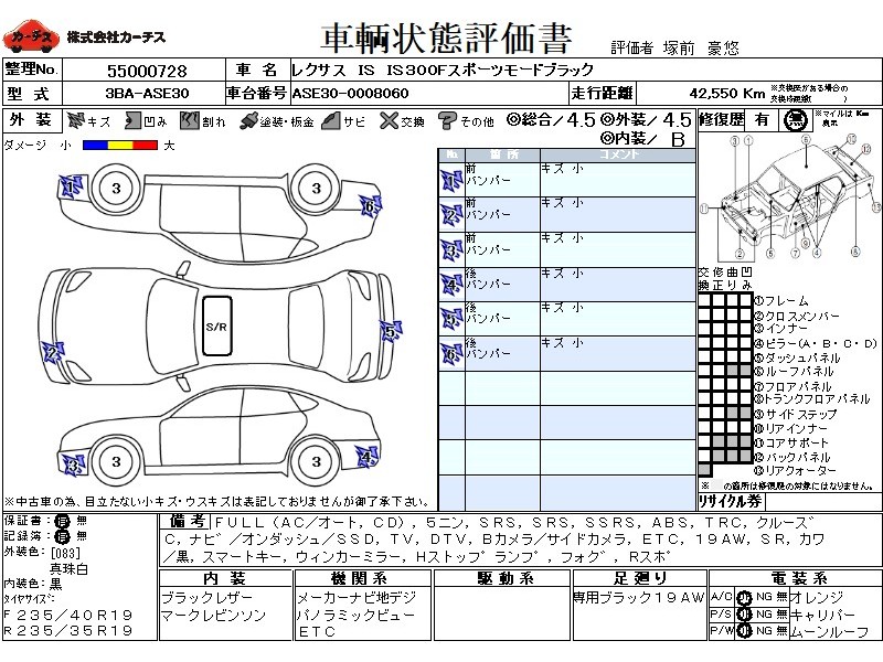 フル装備 / CD / 乗車定員(5人) / エアバッグ / 助手席エアバッグ / サイドエアバッグ / ABS / トラクションコントロール / クルーズコントロール / カーナビゲーション(オンダッシュ,SSD) / テレビ(アナログ) / 地デジTV / バックカメラ(サイドカメラ) / ETC / アルミホイール(19インチ) / サンルーフ / 革シート(黒) / スマートキー / ウインカーミラー / ハイマウントストップランプ / フォグランプ / リアスポイラー /