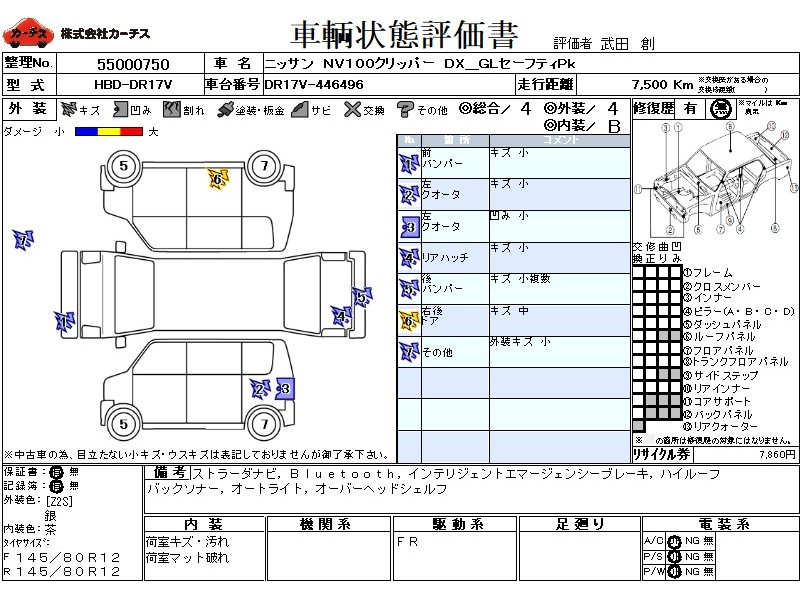 乗車定員(4人) / エアコン(マニュアル) / パワーステアリング / パワーウィンドウ / エアバッグ / 助手席エアバッグ / ABS / カーナビゲーション(社外) / キーレスエントリー / ハイマウントストップランプ /
