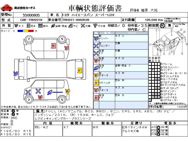 フル装備 / CD(社外) / MD(社外) / 乗車定員(8人) / エアバッグ / 助手席エアバッグ / ABS / カーナビゲーション(社外)(インダッシュ,2DIN) / ETC(社外) / アルミホイール(社外)(15インチ) / キーレスエントリー / フォグランプ /