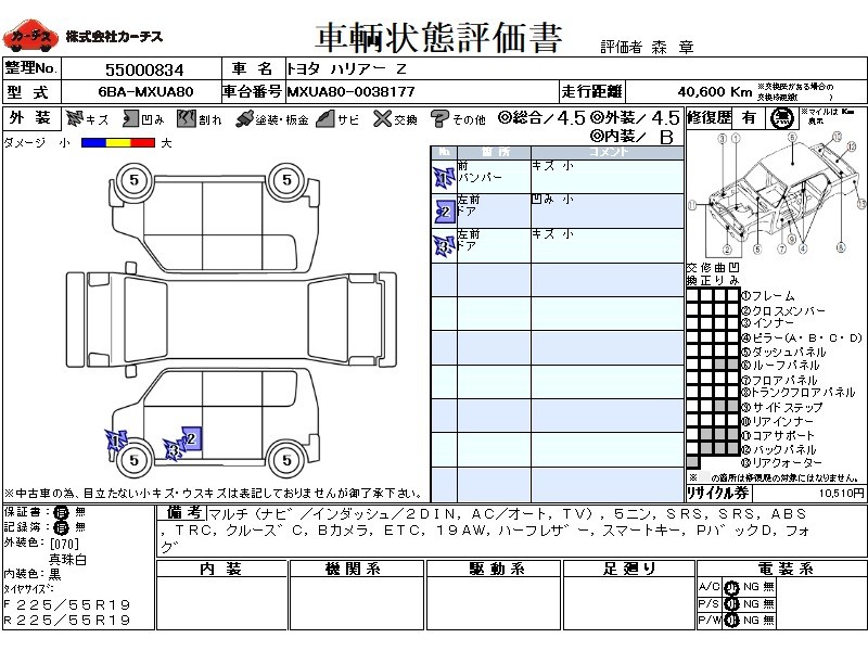 マルチ(ナビ) / エアコン(オート) / テレビ(アナログ) / 乗車定員(5人) / パワーステアリング / パワーウィンドウ / エアバッグ / 助手席エアバッグ / ABS / トラクションコントロール / クルーズコントロール / バックカメラ / ETC / アルミホイール(19インチ) / ハーフレザーシート / スマートキー / パワーバックドア / フォグランプ /