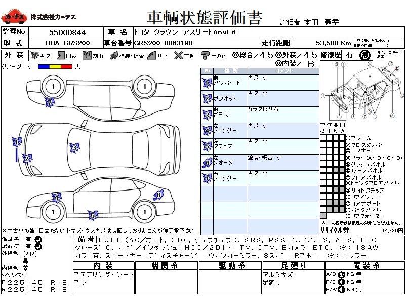 フル装備 / CD / 集中ドアロック / エアバッグ / 助手席エアバッグ / サイドエアバッグ / ABS / トラクションコントロール / クルーズコントロール / カーナビゲーション(インダッシュ,HDD,2DIN) / テレビ(アナログ) / 地デジTV / バックカメラ / ETC / アルミホイール(社外)(18インチ) / 革シート(茶) / スマートキー / ディスチャージ / ウインカーミラー / ハイマウントストップランプ / サイドスポイラー / リアスポイラー / マフラー(社外) / 足回り /