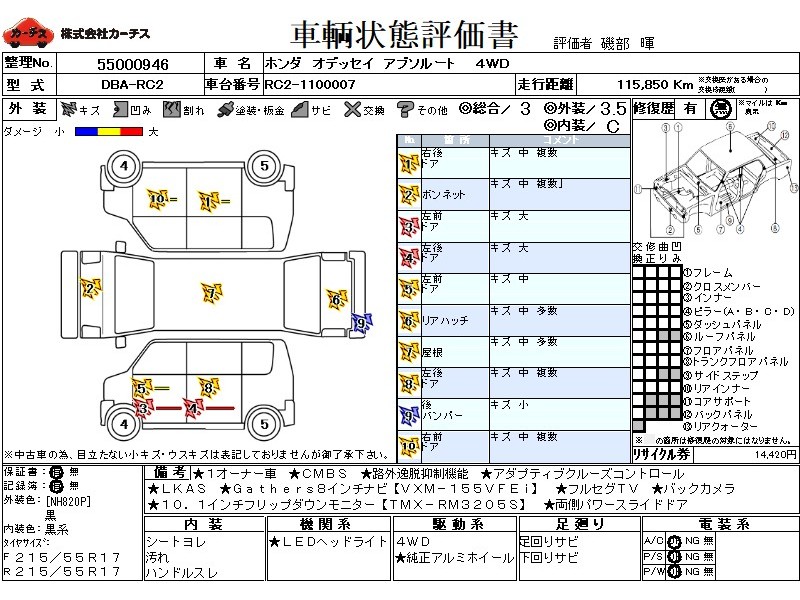 フル装備 / CD / 乗車定員(8人) / 集中ドアロック / エアバッグ / 助手席エアバッグ / サイドエアバッグ / ABS / トラクションコントロール / クルーズコントロール / カーナビゲーション(インダッシュ,SSD,2DIN) / 地デジTV / バックカメラ / ETC / アルミホイール(17インチ) / ハーフレザーシート / スマートキー / ウインカーミラー / ハイマウントストップランプ / パワースライドドア / フォグランプ /