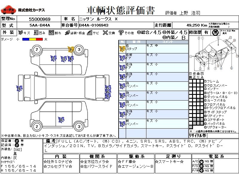 フル装備 / CD(社外) / 乗車定員(4人) / エアバッグ / 助手席エアバッグ / ABS / トラクションコントロール / カーナビゲーション(社外)(インダッシュ,2DIN) / テレビ(アナログ) / バックカメラ(サイドカメラ) / スマートキー / パワースライドドア /