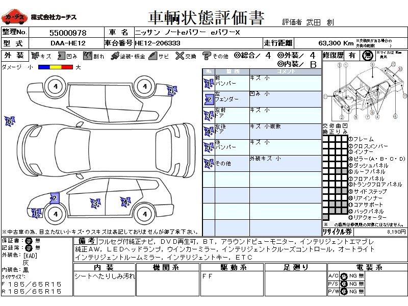 フル装備 / CD / 乗車定員(5人) / エアバッグ / 助手席エアバッグ / ABS / クルーズコントロール / カーナビゲーション(SSD) / テレビ(アナログ) / 地デジTV / バックカメラ / ETC / アルミホイール(15インチ) / スマートキー / ウインカーミラー / ハイマウントストップランプ /