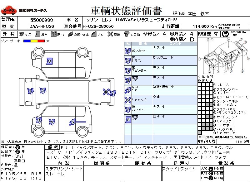 フル装備 / CD / 乗車定員(8人) / 集中ドアロック / エアバッグ / 助手席エアバッグ / ABS / トラクションコントロール / クルーズコントロール / カーナビゲーション(インダッシュ,SSD,2DIN) / テレビ(アナログ) / 地デジTV / フリップダウンモニタ / バックカメラ(サイドカメラ) / ETC / アルミホイール(社外)(15インチ) / キーレスエントリー / スマートキー / ディスチャージ / ハイマウントストップランプ / パワースライドドア / フォグランプ / サイドスポイラー / リアスポイラー /