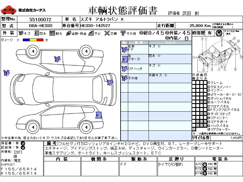 フル装備 / CD(社外) / 乗車定員(4人) / エアバッグ / 助手席エアバッグ / ABS / カーナビゲーション(社外)(HDD) / テレビ(社外) / 地デジTV(社外) / ETC(社外) / アルミホイール(14インチ) / スマートキー / ディスチャージ / ウインカーミラー / ハイマウントストップランプ /