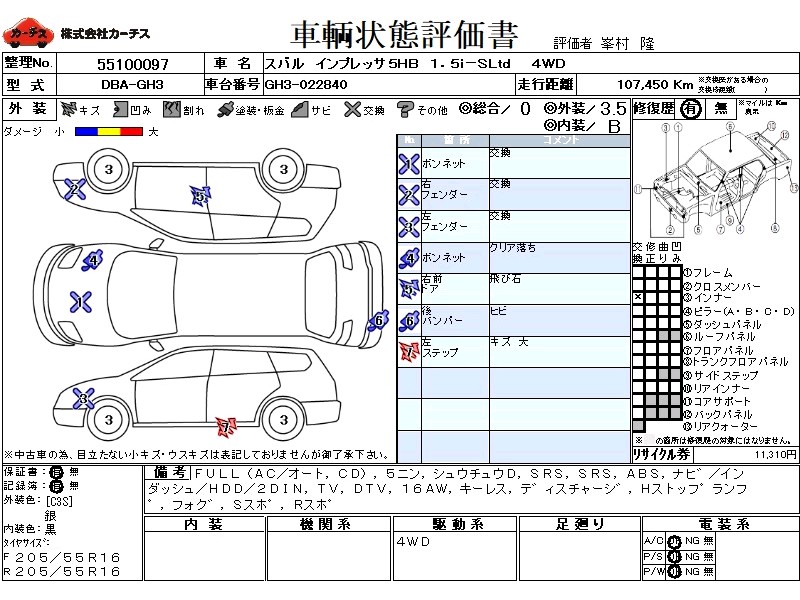 フル装備 / CD / 乗車定員(5人) / 集中ドアロック / エアバッグ / 助手席エアバッグ / ABS / カーナビゲーション(インダッシュ,HDD,2DIN) / テレビ(アナログ) / 地デジTV / ETC(社外) / アルミホイール(16インチ) / キーレスエントリー / ディスチャージ / ハイマウントストップランプ / フォグランプ / フロントスポイラー(社外) / サイドスポイラー / リアスポイラー /