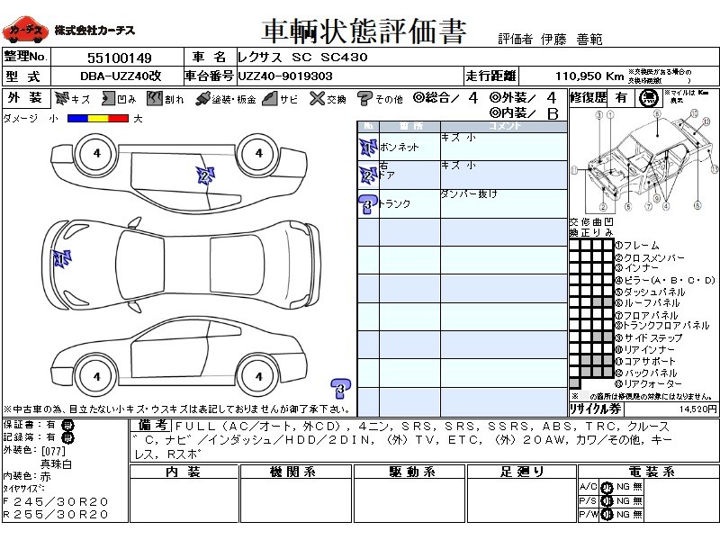 フル装備 / CD(社外) / 乗車定員(4人) / エアバッグ / 助手席エアバッグ / サイドエアバッグ / ABS / トラクションコントロール / クルーズコントロール / カーナビゲーション(インダッシュ,HDD,2DIN) / テレビ(社外) / 地デジTV(社外) / ETC / アルミホイール(社外)(20インチ) / 革シート(その他) / キーレスエントリー / フロントスポイラー(社外) / サイドスポイラー(社外) / リアスポイラー / リアアンダースポイラー(社外) / マフラー(社外) / 足回り /
