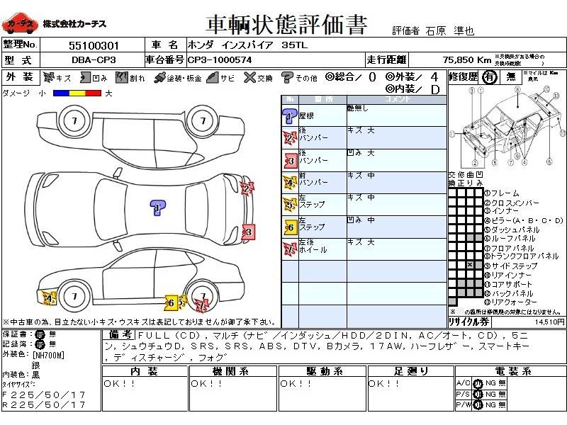 フル装備 / CD / マルチ(ナビ) / エアコン(オート) / 乗車定員(5人) / 集中ドアロック / エアバッグ / 助手席エアバッグ / ABS / 地デジTV / バックカメラ / アルミホイール(17インチ) / ハーフレザーシート / スマートキー / ディスチャージ / フォグランプ /