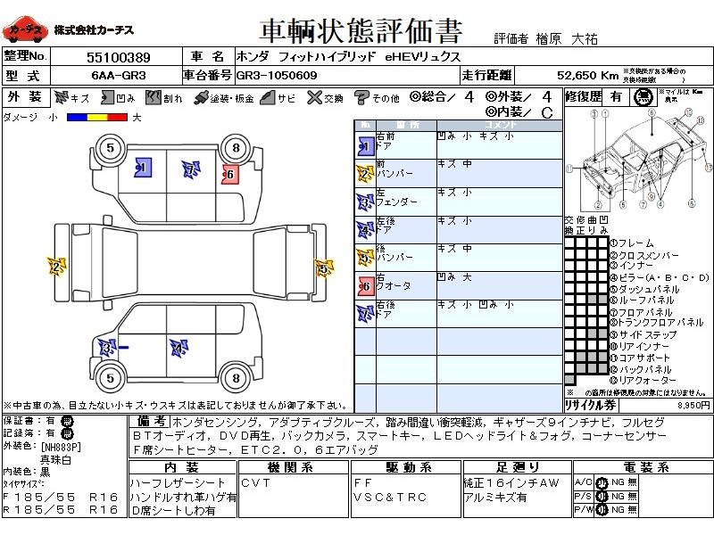 フル装備 / CD / エアバッグ / 助手席エアバッグ / サイドエアバッグ / ABS / トラクションコントロール / クルーズコントロール / カーナビゲーション(インダッシュ,2DIN) / 地デジTV / バックカメラ / ETC / アルミホイール(16インチ) / スマートキー / ウインカーミラー / フォグランプ /