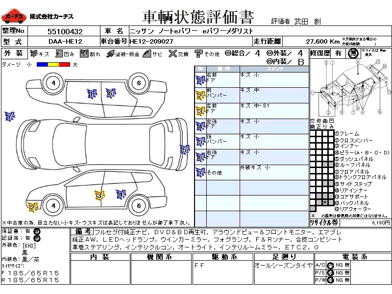 フル装備 / CD / 乗車定員(5人) / エアバッグ / 助手席エアバッグ / ABS / クルーズコントロール / カーナビゲーション(SSD) / テレビ(アナログ) / 地デジTV / バックカメラ(フロント) / ETC / アルミホイール(15インチ) / スマートキー / ウインカーミラー / ハイマウントストップランプ / フォグランプ /
