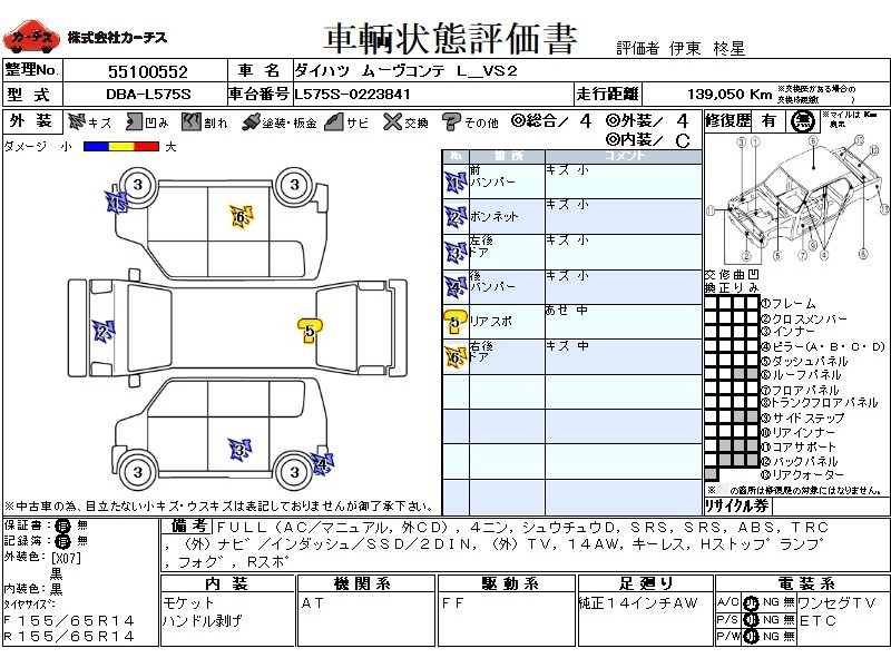 フル装備 / CD(社外) / 乗車定員(4人) / 集中ドアロック / エアバッグ / 助手席エアバッグ / ABS / トラクションコントロール / カーナビゲーション(社外)(インダッシュ,SSD,2DIN) / テレビ(社外) / ETC(社外) / アルミホイール(14インチ) / キーレスエントリー / ハイマウントストップランプ / フォグランプ / リアスポイラー /