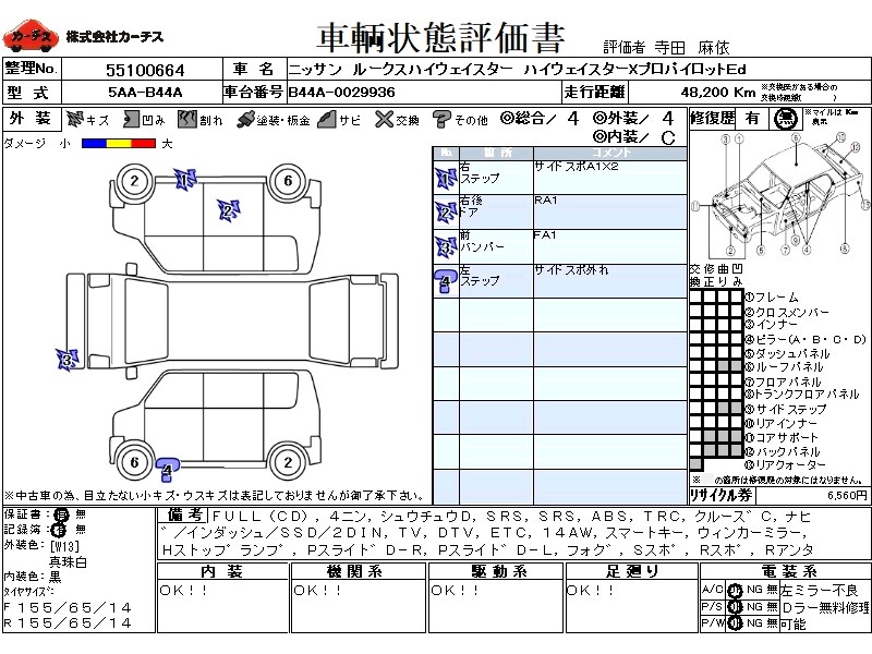フル装備 / CD / 乗車定員(4人) / 集中ドアロック / エアバッグ / 助手席エアバッグ / ABS / トラクションコントロール / クルーズコントロール / カーナビゲーション(インダッシュ,SSD,2DIN) / テレビ(アナログ) / 地デジTV / ETC / アルミホイール(14インチ) / スマートキー / ウインカーミラー / ハイマウントストップランプ / パワースライドドア / フォグランプ / サイドスポイラー / リアスポイラー / リアアンダースポイラー /