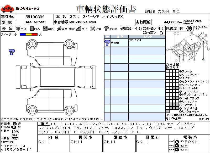 フル装備 / CD / 乗車定員(4人) / 集中ドアロック / エアバッグ / 助手席エアバッグ / ABS / トラクションコントロール / カーナビゲーション(インダッシュ,SSD,2DIN) / テレビ(アナログ) / 地デジTV / バックカメラ / アルミホイール(14インチ) / スマートキー / ウインカーミラー / ハイマウントストップランプ / パワースライドドア /
