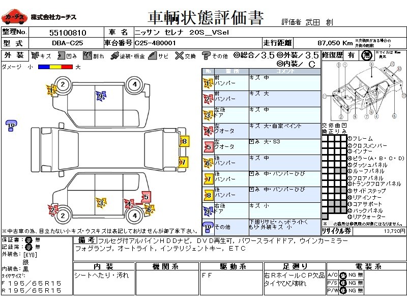 フル装備 / CD(社外) / 乗車定員(8人) / エアバッグ / 助手席エアバッグ / ABS / カーナビゲーション(社外)(HDD) / テレビ(社外) / 地デジTV(社外) / ETC / スマートキー / ウインカーミラー / ハイマウントストップランプ / パワースライドドア / フォグランプ /