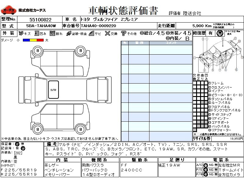 マルチ(ナビ) / エアコン(オート) / テレビ(アナログ) / 乗車定員(7人) / パワーステアリング / パワーウィンドウ / エアバッグ / 助手席エアバッグ / サイドエアバッグ / ABS / トラクションコントロール / クルーズコントロール / バックカメラ(フロント) / ETC / アルミホイール(19インチ) / サンルーフ / 革シート(その他) / スマートキー / パワースライドドア / パワーバックドア / フォグランプ / リアスポイラー /